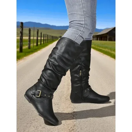 Women’s Black Faux Leather Knee-High Slouch Boots – Side Zip and Buckle Strap Detail, Riding & Fall Fashion 2025