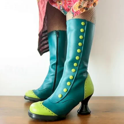 Women’s Vintage Teal and Lime Button-Up Knee-High Boots with Sculpted Heels – Retro Cosplay and Statement Fashion Footwear 2025