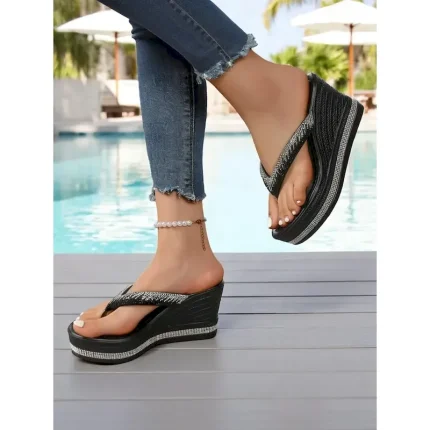 Women’s Rhinestone Platform Flip Flop Sandals – Glitter Wedge Beach Shoes for Summer Vacation, Poolside, and Casual Outings 2025