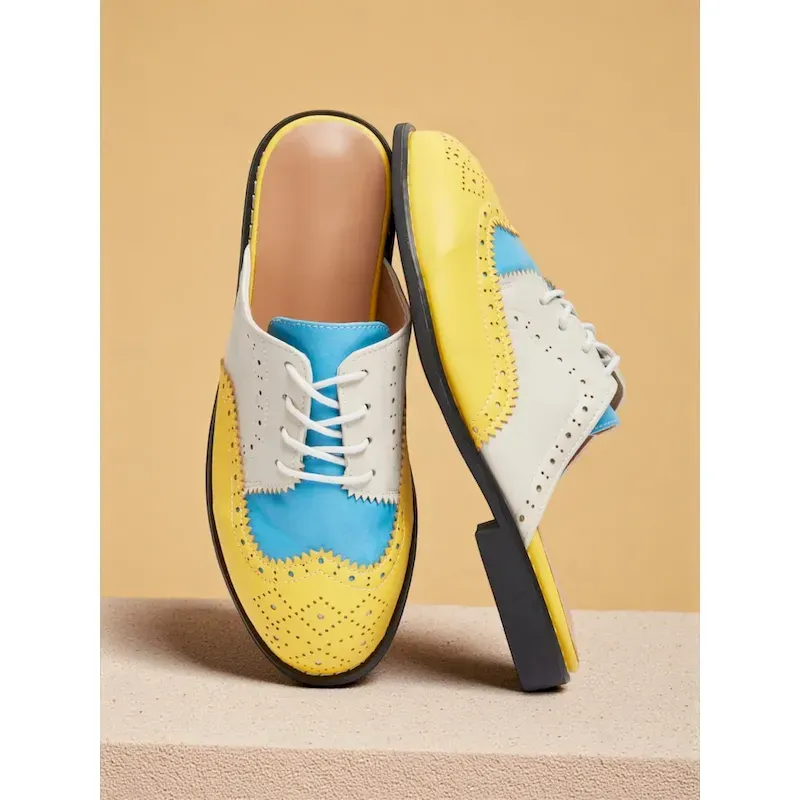 Women’s 1950s Vintage Colorblock Wingtip Mule Oxford Shoes – Yellow Blue Slip-On Lace-Up Flats for Casual Street Style, Outings and Weekend Travel 202
