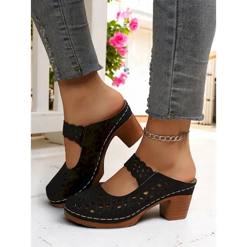 Women’s Slip-On Hollow Out Chunky Heel Mules – Faux Leather Vintage Sandals, Perfect for Casual Strolls, Backyard Brunch, Outdoor Art Fair and Spring
